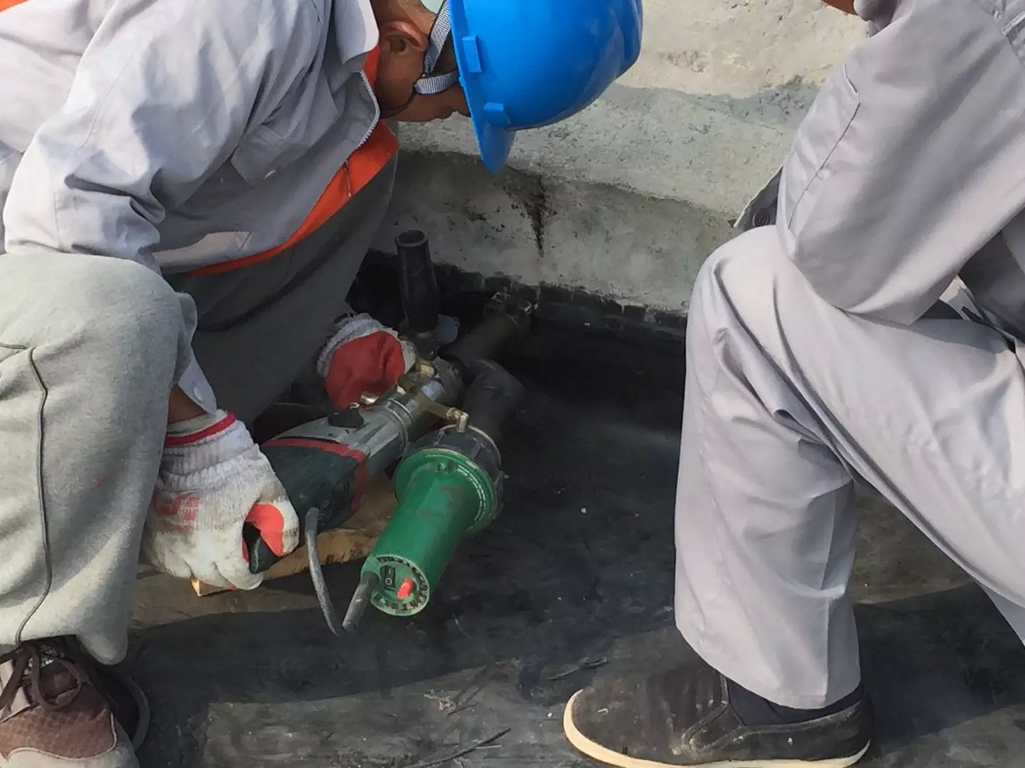 (1)焊接运用楔焊机,选用双轨热熔焊接。楔焊机无法焊接的部位,应选用挤出式热熔焊机,配以与原材料同质的焊条,构成堆焊的单焊缝。