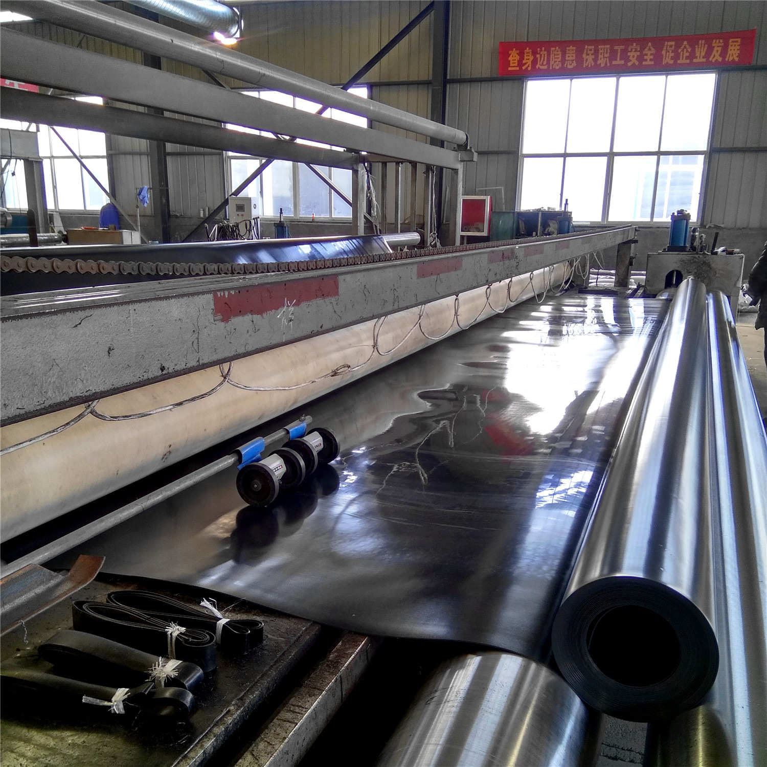 土工膜的卷长可以按工程要求定做下卷,但也不宜太长,因为太长在施工中较重较麻烦,具体的卷长要根据工地的实际要求来定做生产。一般常用的卷长为50米长。土工膜的幅宽在生产时就没有那么灵活了,受设备的影响,一般厂家所用的生产设备也就做到6米宽,常用的是1~6米,而我公司的生产设备的幅宽可控制在8米,也就是可以生产8米宽的,这样的话在有些工程的幅宽选择8米时,可以考虑我公司采购。