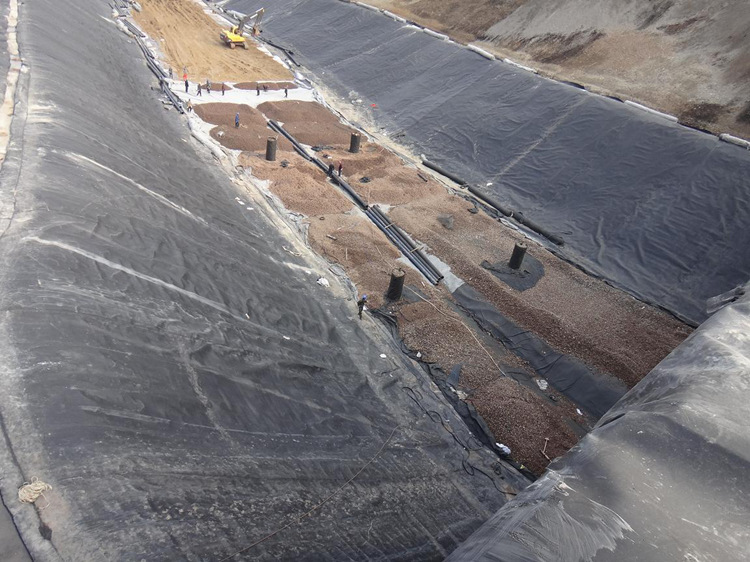 双层防渗结构从上至下为:垃圾物、织质土工布、排水层、土工布、上层HDPE膜、土工复合排水网、下层HDPE膜、保护层(粘土或土工布)、基底,采用双层HDPE防渗膜,增强了防渗效果,两层膜之间的排水网能起到渗漏检测及排除污水的作用。