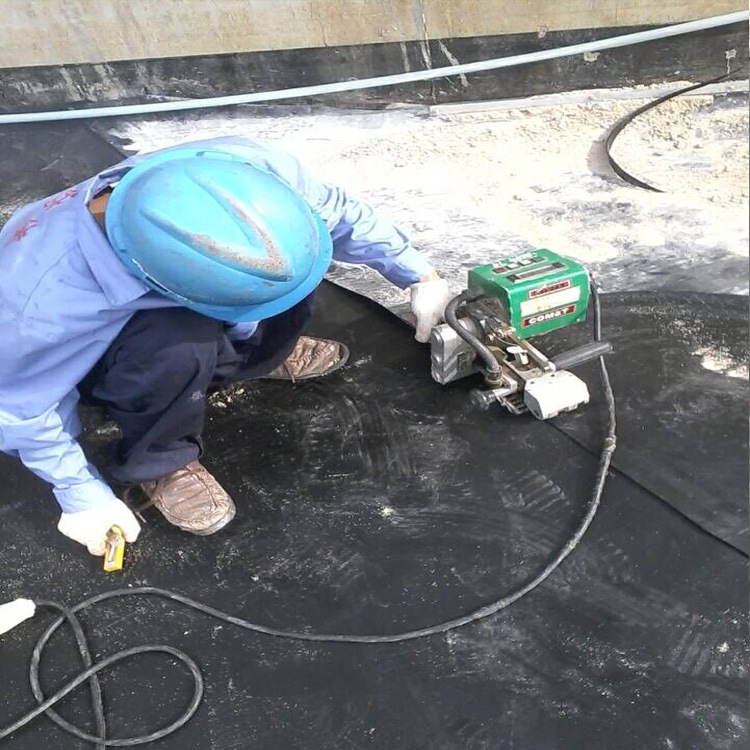 热熔焊接前须将上下两层防渗膜重叠15公分,焊接工序分为:调节压力、设定温度、设定速度、焊缝搭接检查、装膜入机、启动马达。焊缝要求整齐、美观、不得有滑焊、跳走现象。焊接的温度、速度和压力经过实验和检测后确定。焊缝处位于上层防渗膜的边缘应打磨成的倾角,以提高焊缝的焊接质量。褶皱部分的边缘,剪去裂痕的皱纹以保证平坦重叠。挤压焊接裂纹或皱纹切除部分时,其重叠应不小于10厘米。应避免十字搭接,采用丁字交错焊接形式。焊缝要求整齐和美观,不得有滑焊或跳走的现象。