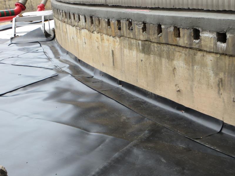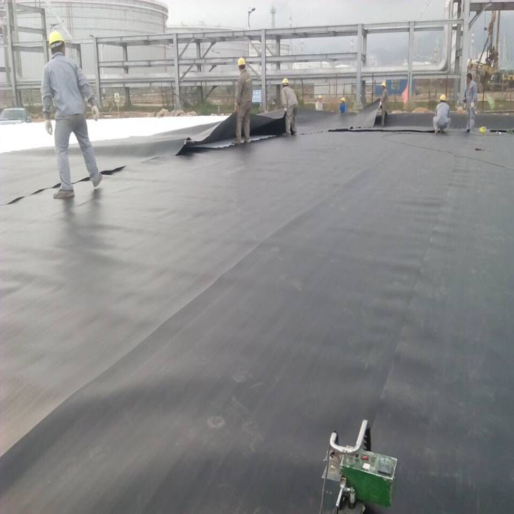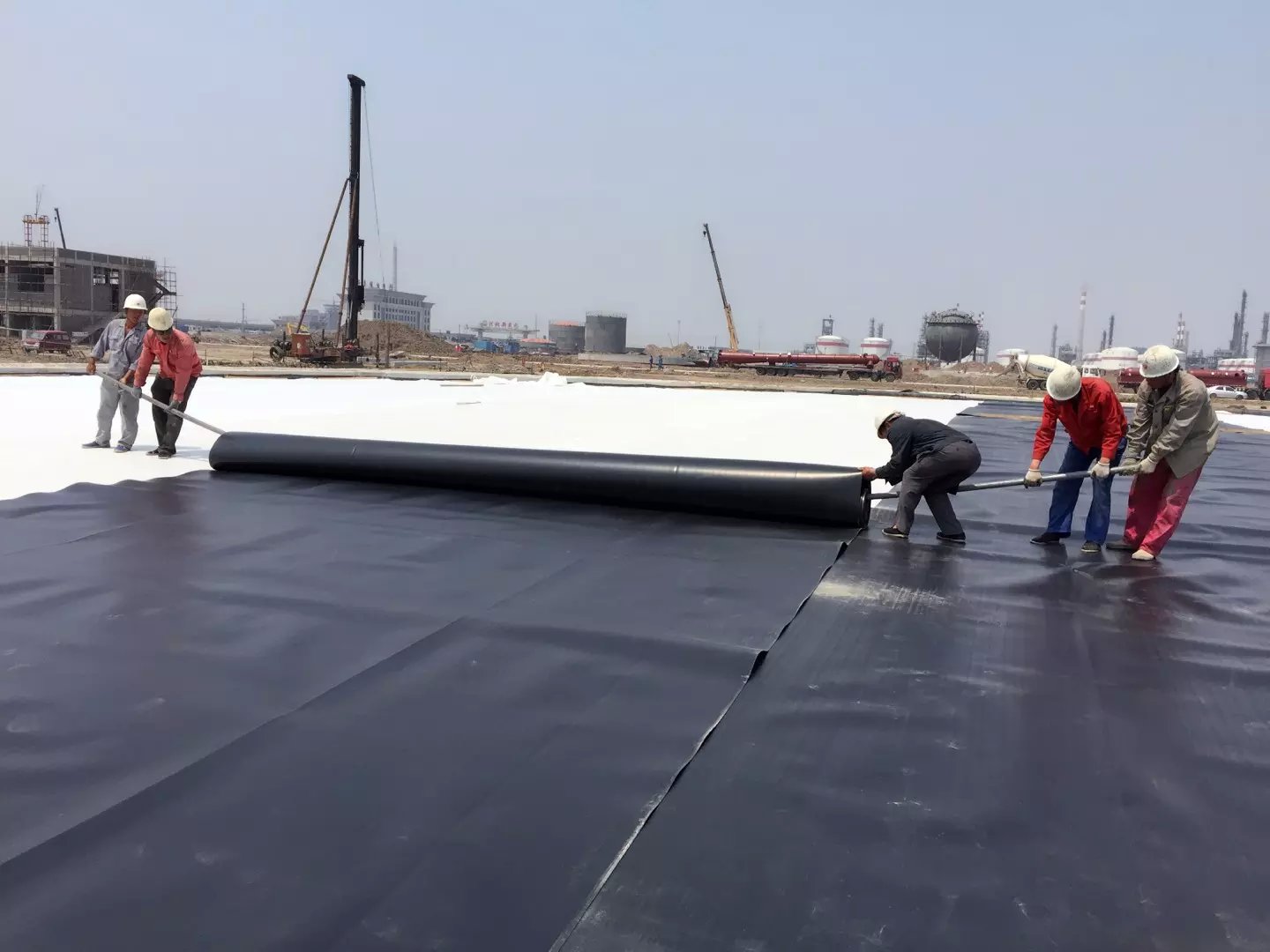 4、 铺贴平面与立面相连接的防渗膜,应由下向上进行,使防渗膜紧贴阴阳角,铺展时对卷材不可拉得太紧,且不得有皱褶、空鼓等现象。